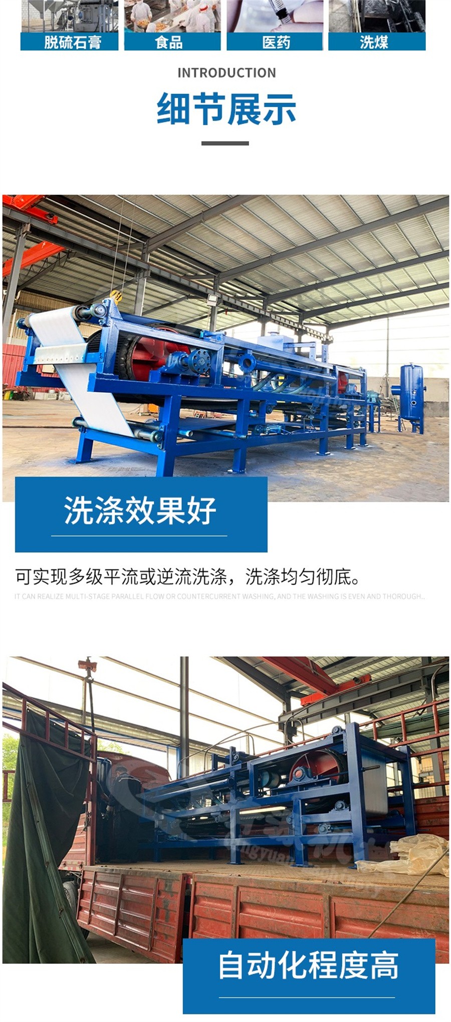 3: 濾工藝方便; 濾餅厚度. 洗水量. 逆流洗滌級(jí)數(shù). 真 空度. 濾布速度任意調(diào)整,以達(dá)到更佳過(guò)濾效果。 4 : 洗滌效果好; 可實(shí)現(xiàn)多級(jí)平流或逆流洗滌,洗滌均勻徹底,母液和洗滌液根據(jù) 工藝需要可分開(kāi)收集和再利用。