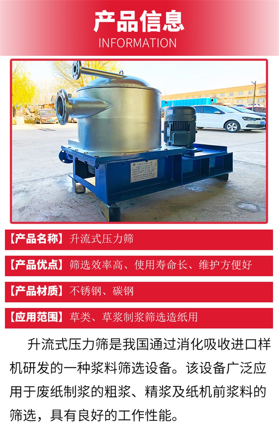 了年產(chǎn)二百多臺(tái)的輝煌成績(jī)。目前公司生產(chǎn)的壓力篩可用不銹鋼(304)和A3板兩種材料制作,精鑄304葉片和轉(zhuǎn)子,進(jìn)出漿管路(漿料濃度)可選用自