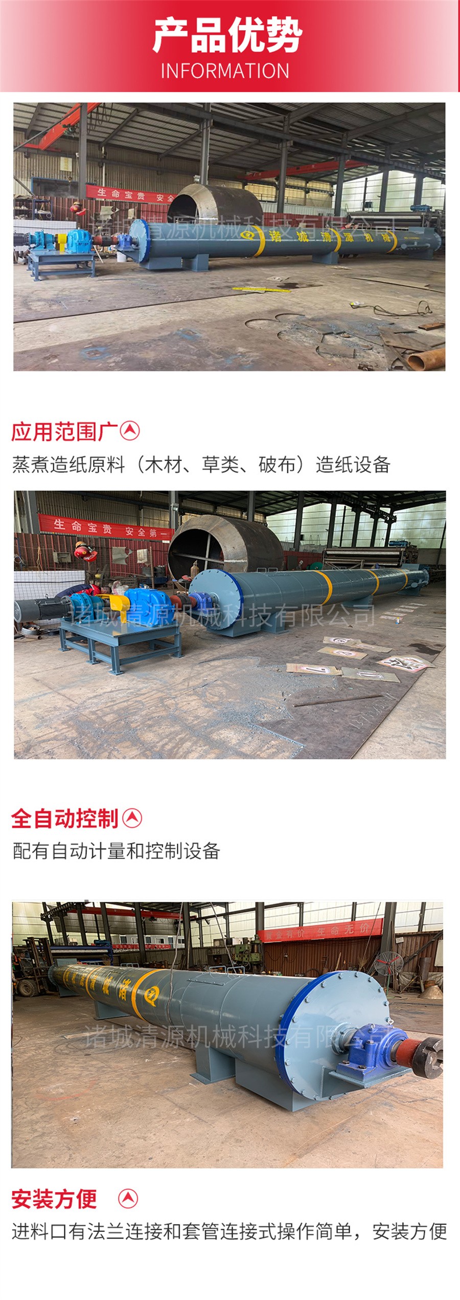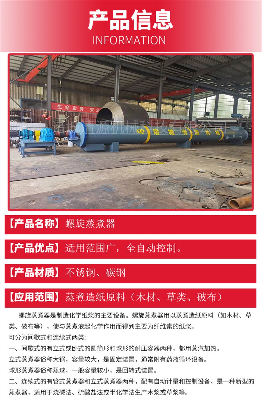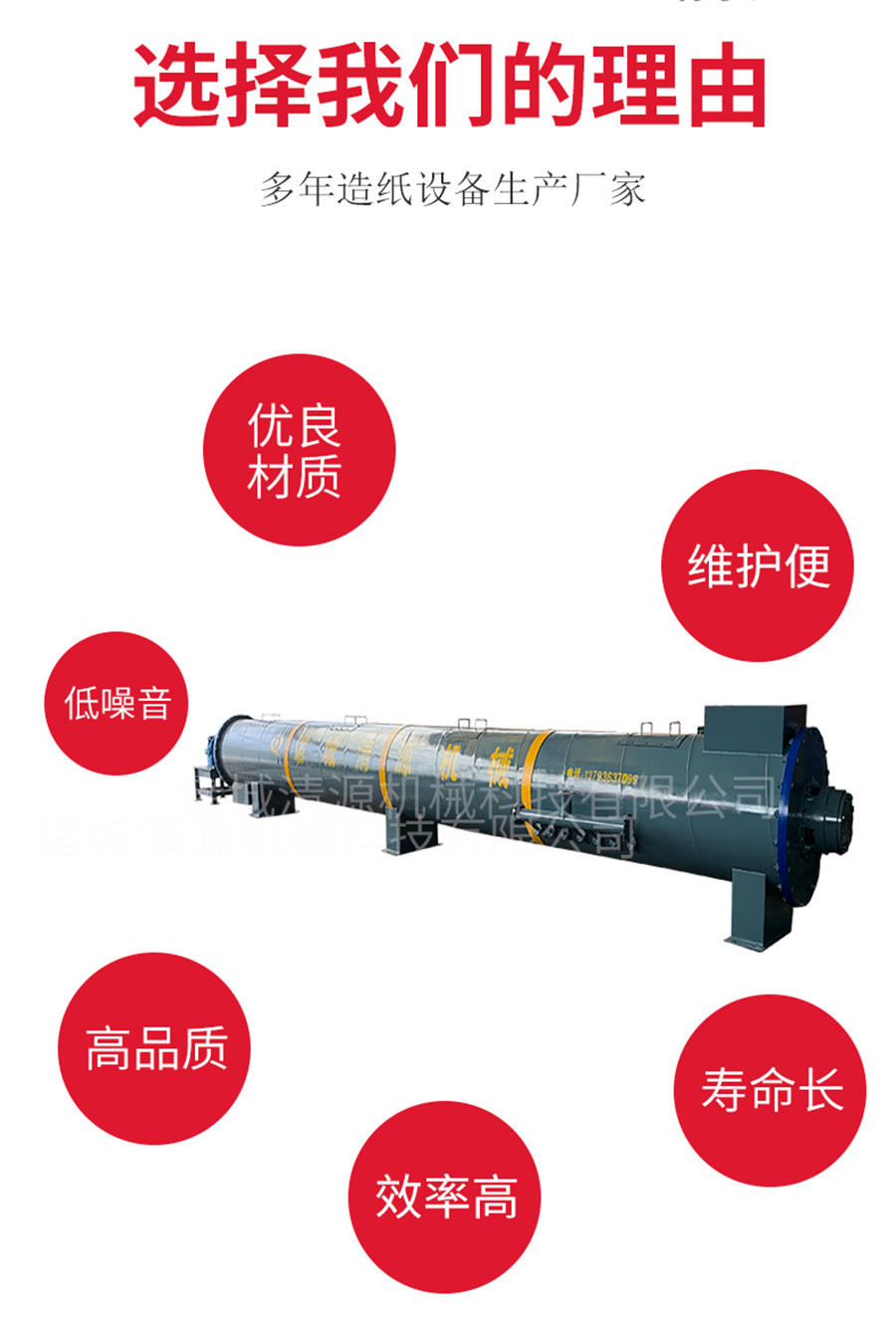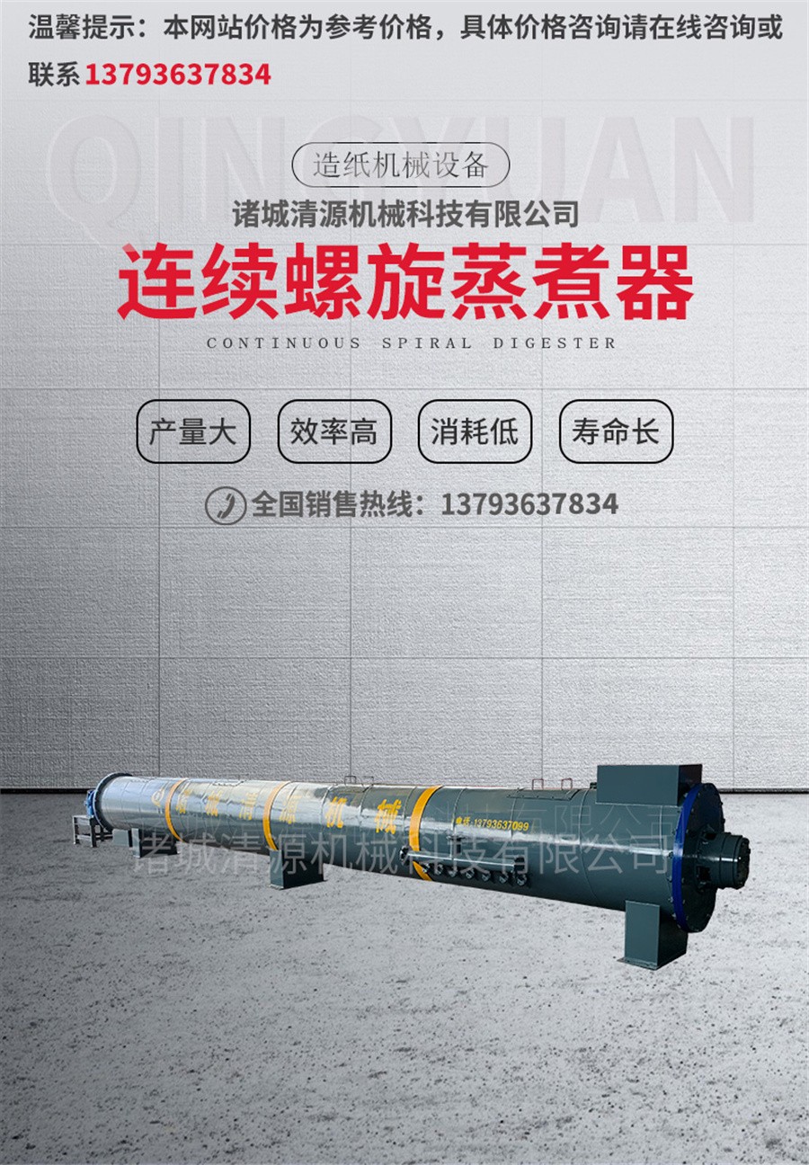諸城清源機(jī)械科技有限公司生產(chǎn)的螺旋蒸煮器用以蒸煮造紙?jiān)希ㄈ缒静摹⒉蓊?、破布等),使與蒸煮液起化學(xué)作用而得到主要為纖維素的紙漿。