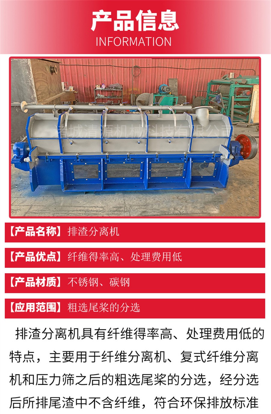 諸城清源機械生產(chǎn)的排渣分離機轉(zhuǎn)子是帶葉片的長圓柱體結(jié)構(gòu),葉片靠近設(shè)備主體,轉(zhuǎn)子上葉片的角度是預(yù)設(shè)定的,為更優(yōu)化的角度。軸的設(shè)計可使傳動皮帶安裝在設(shè)備兩端中的任一端。由位于殼體兩側(cè)的兩端軸承座支撐轉(zhuǎn)子。殼體蓋子易于拆卸,易于檢修內(nèi)部元件,進(jìn)口管和皮帶輪不需拆下即可檢修轉(zhuǎn)子或篩板。蓋子上設(shè)有防止?jié){料軸向回流的擋板,由轉(zhuǎn)子推動漿料向前運動。良漿出口槽和排渣槽都是總體結(jié)構(gòu)的一部分,良漿槽是用來收集濾液的,它的設(shè)計增加了設(shè)備強度。排渣槽位于進(jìn)口末端對面的支腿上。帶孔的篩板是半圓柱形的,篩板上的通孔可因使用條件的不同而不同。篩板用螺栓固定在殼體上。